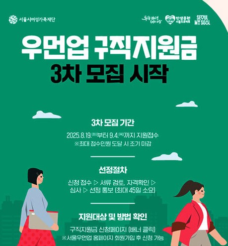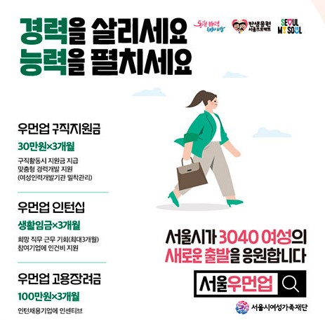 **‘서울우먼업 구직지원금’**은 서울시와 서울시여성가족재단이 주관하는 사업으로, 출산·육아 등으로 경력이 단절되었거나 미취업 상태에 있는 30대~40대 여성을 위한 구직 지원 사업입니다.