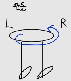 그림을 보며 더 자세히 설명하자면, 하체가 왼쪽으로 회전을 하고있다. 다리 위에 있는 골반이 다리를 따라 왼쪽으로 돌게되면 사람의 몸은 계속 왼쪽으로 빙그르 돌것이다. 따라서 몸이 돌지않기 위해 골반이 다리와 반대와 반대방향으로 오른쪽으로 회전을 발생하며 보상작용을 하게 되는 것이다.