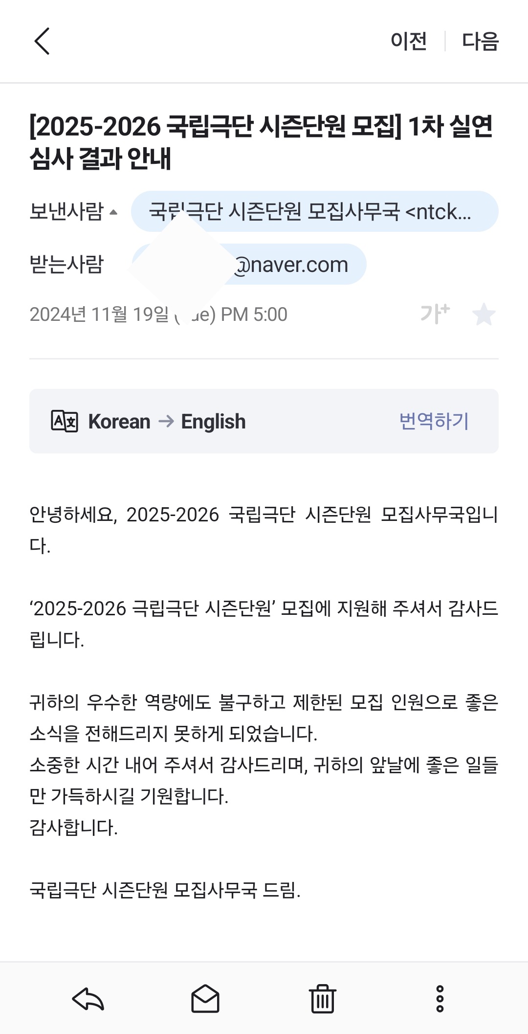 지난 11월 6일 국립극단 시즌 단원 오디션을 보고왔다. 결과는 탈락!