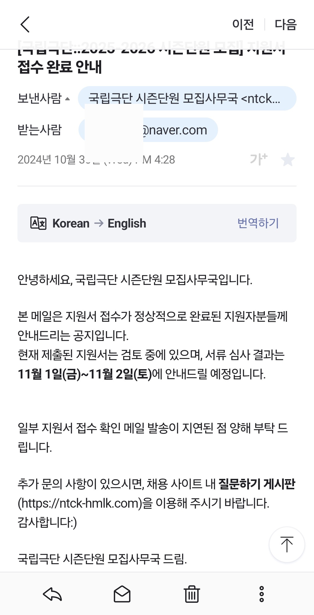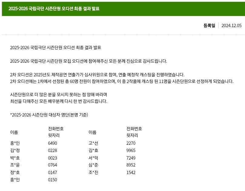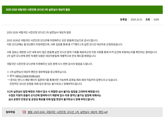 공고는 국립극단 사이트에 10월 8일에 공고가 떴다. 보통 10월 중으로 뜨니 관심이 있다면 10월달에 국립극단 사이트를 방문해보면 좋을 거 같다.