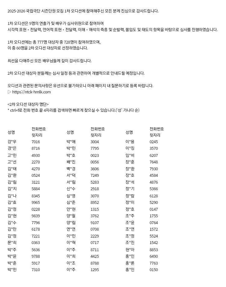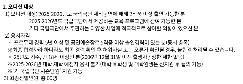 이번 시즌은 25년부터 26년까지 총 2년 동안 활동할 배우들을 모집했으므로 아마 다음 단원 오디션은 26년도 10월 달쯤에 공지가 뜨지 않을까 하고 예상해본다. 아래 사진은 공지 중에서도 중요한 자격과 절차에 관한 부분이다.