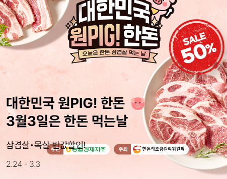 - 삼겹살 및 목살 할인 판매: 행사 기간 동안 신선한 국내산 삼겹살과 목살을 최대 50% 할인된 가격에 제공합니다.
