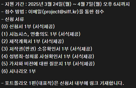 지원 기간은 매년 4월 초부터 중순까지 진행되며, 접수 방법은 이메일(project@siff.kr)을 통한 접수입니다. 신청 서류로는 신청서, 시놉시스 및 연출의도, 제작계획서, 저작권 소유확인서, 성범죄·성희롱 사실확인서, 가치와 비전에 대한 질문지, 시나리오, 포트폴리오 등이 필요합니다.