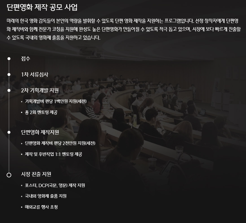 - 단편영화제작지원: 기획개발지원작 중 최대 6작품을 선정하여, 각 작품당 최대 1,500만 원의 제작지원금을 지원합니다. 또한, 제작 및 후반 작업에 대한 1:1 멘토링, 현장 스틸컷 촬영, 포스터 및 DCP(국·영문) 제작 지원, 국내외 영화제 출품 지원(배급사 연계 및 출품비 포함), 국내 상영회 제공 등의 혜택이 주어집니다.