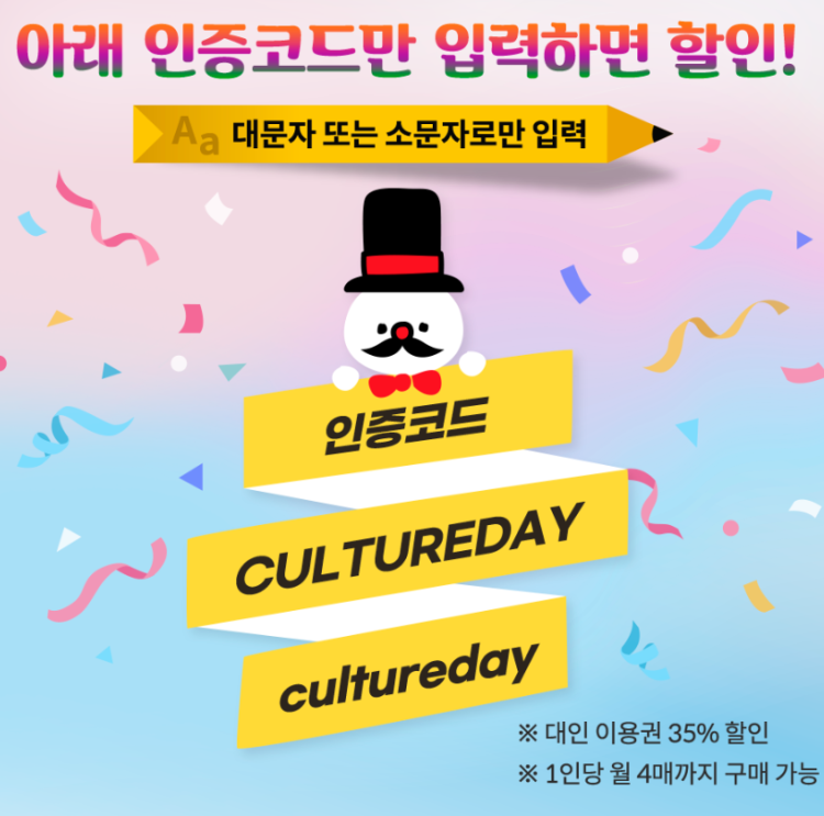• 인증코드 유효성: 인증코드는 매월 '문화가 있는 날'에만 유효하며, 다른 날에는 적용되지 않습니다.