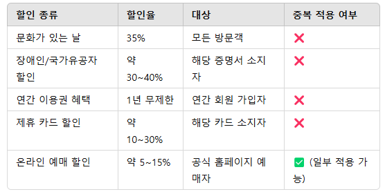 ‘문화가 있는 날’ 할인이 가장 높은 할인율(35%)을 제공하지만, 다른 혜택과 중복 적용이 되지 않으므로 본인의 상황에 맞는 최적의 할인 방법을 선택하는 것이 중요합니다.
