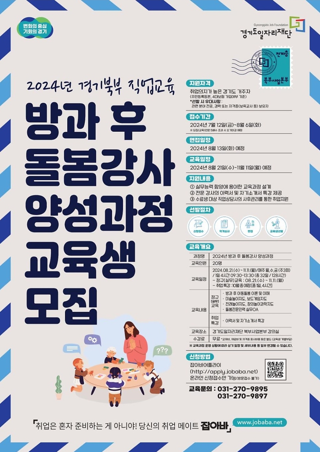 2024년 경기북부 직업교육 방과 후 돌봄강사 양성과정 교육생 모집 공고 1. 사 업 명 : 2024년 경기북부 직업교육 방과 후 돌봄강사 양성과정 2. 사업내용 : 아동 돌봄 관련 초등학교 방과 후