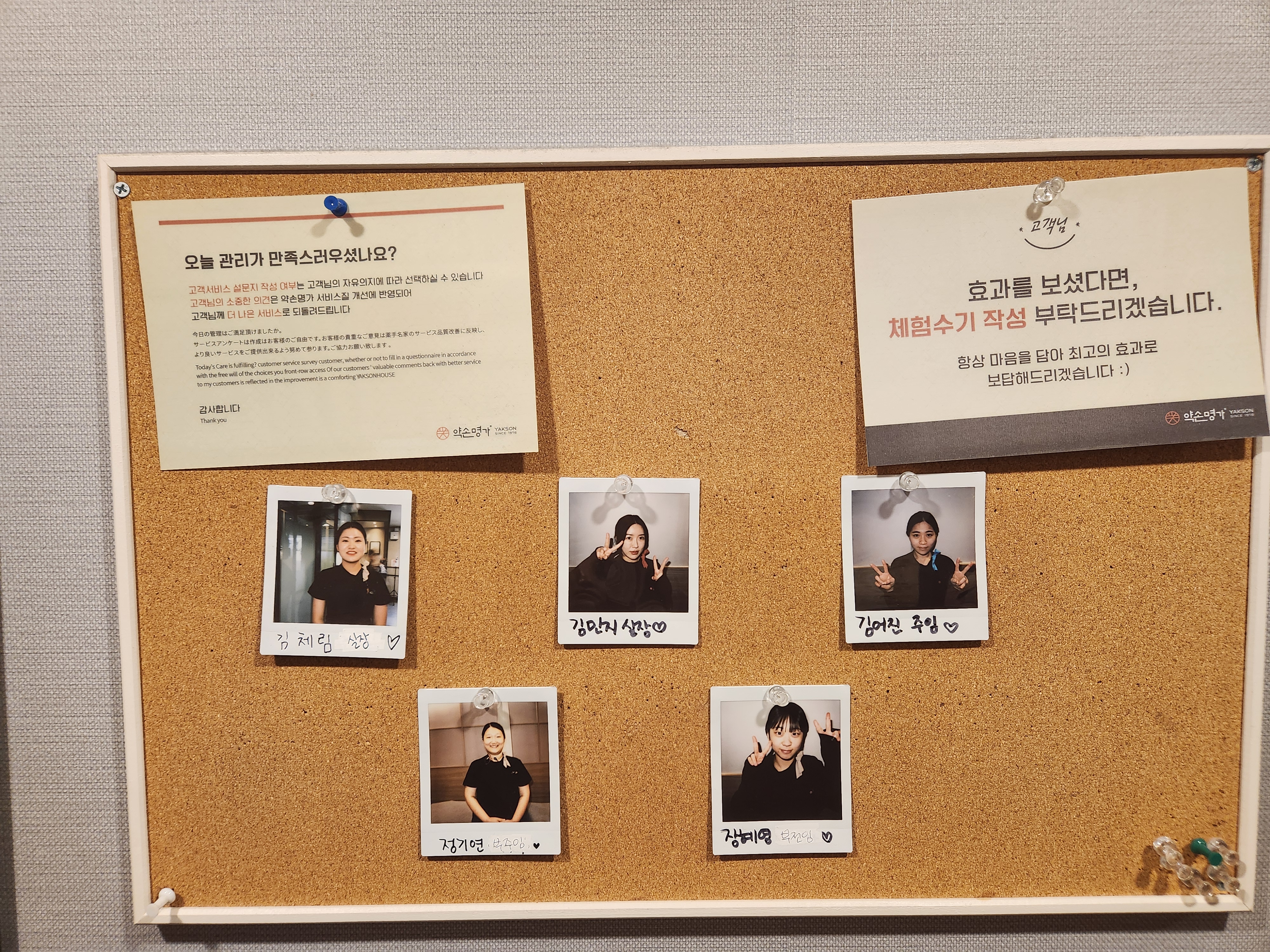- 얼굴 관리 부분은 선생님 3분 중에 랜덤으로 들어온다 해서 선생님 지정이 가능한지 물어봤는데 보통은 어렵고, 선생님들 스케줄에 내가 맞춰서 오면 가능하다고는 했다. 또한 관리를 받은 후 불편했던 선생님이 있으면 그때는 그 분을 제외하고 관리가 진행되게는 가능하다고 했다.
