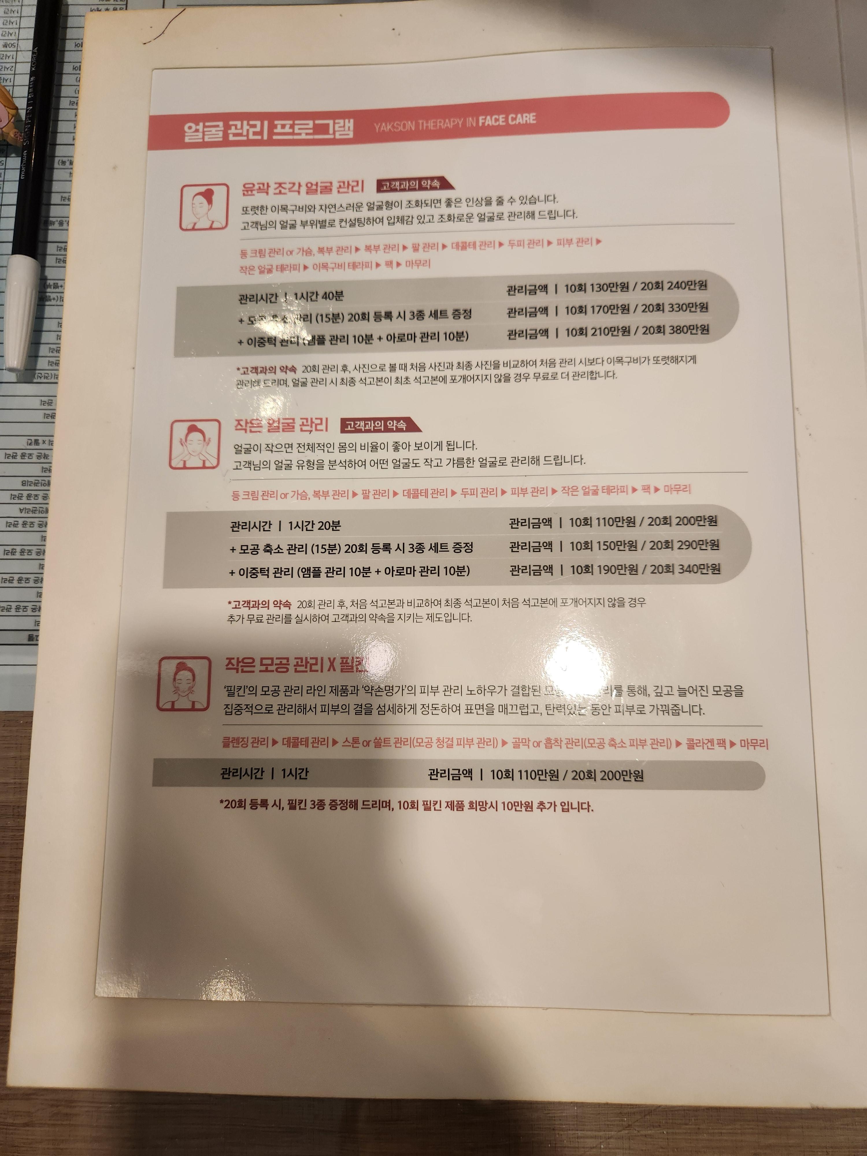 관리를 받을 때 다음 단계로 넘어갈 때마다 선생님이 무슨 단계입니다. 라고 설명을 해주신다. 당시엔 '피부관리'라고 해서 피부관리인 줄 알았는데 나와서 표를 보니 '얼굴 탄력' 관리였다.