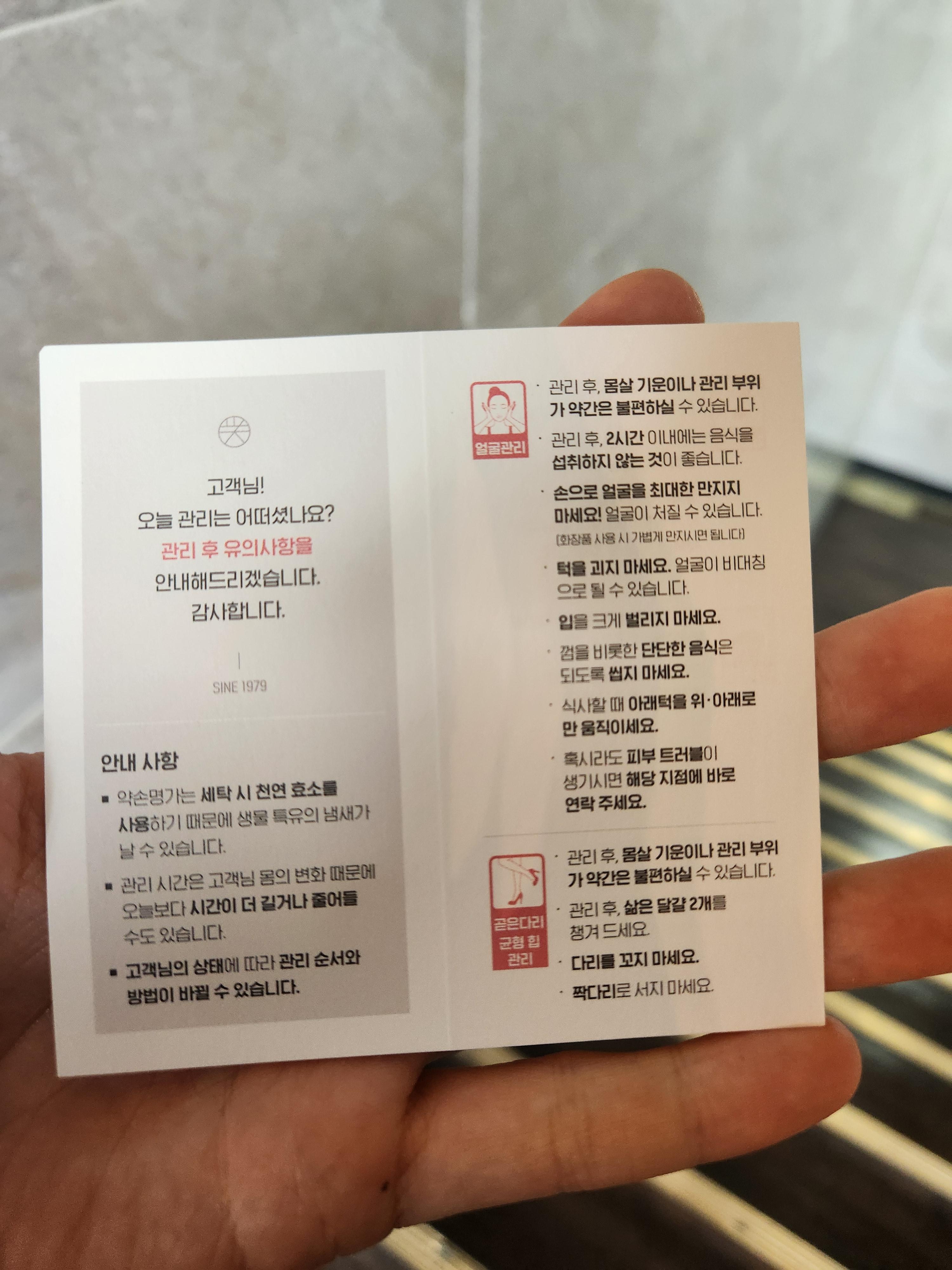 -마사지는 기본적으로 시원한 느낌쪽에 해당했고, 좀 더 세도 되겠다는 느낌을 받았다. 관리해주시는 선생님들바다 차이가 좀 심할 수 있겠다는 생각을 했다.