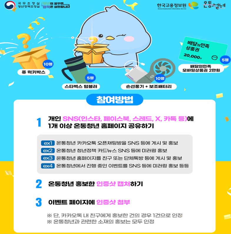 - 목적: 다양한 SNS 채널을 활용해 온통청년 홈페이지 및 청년정책 정보를 널리 알리고, 홈페이지 방문 유도 및 인지도 제고를 목적으로 진행되는 바이럴 마케팅 이벤트입니다