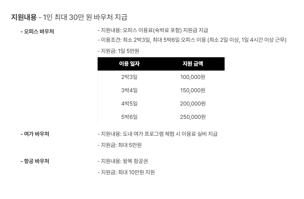 - 오피스(숙박): 워케이션 오피스 및 숙박비 지원