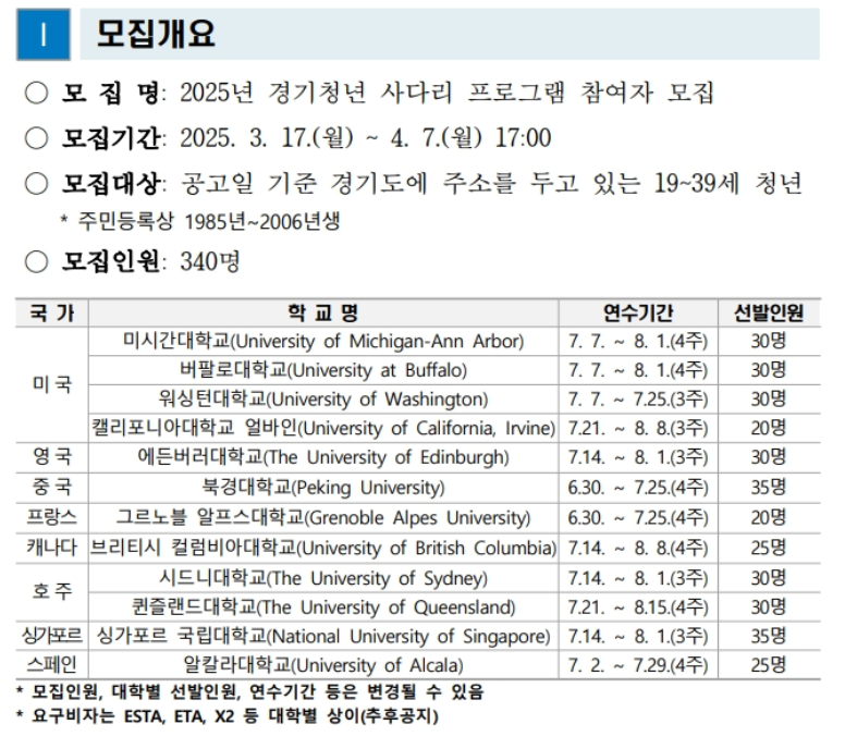 경기 청년 사다리 프로그램 연수 국가 및 대학