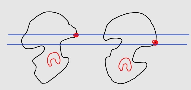 지금까지의 내용을 다시 정리해보자면 무명골의 전방 쏟아짐으로 인해 > 비구의 방향이 아래로 향하고 > 대퇴골의 시작점이 아래로 내려와 > 그쪽 다리가 더 아래쪽으로 내려오게 된다.