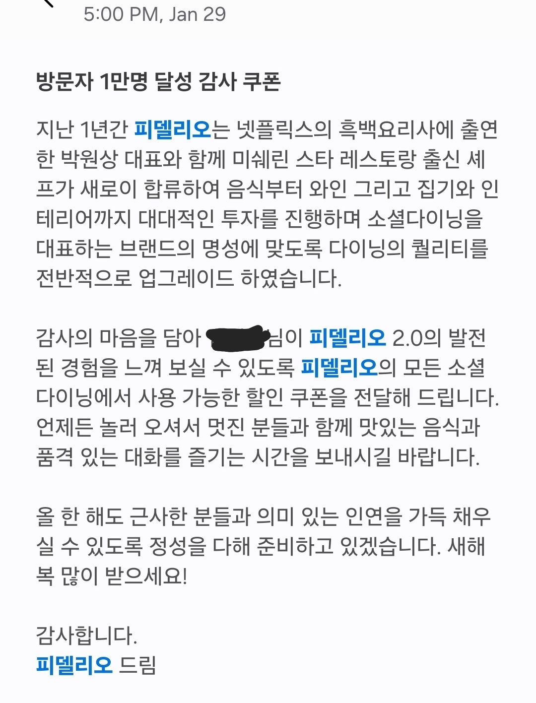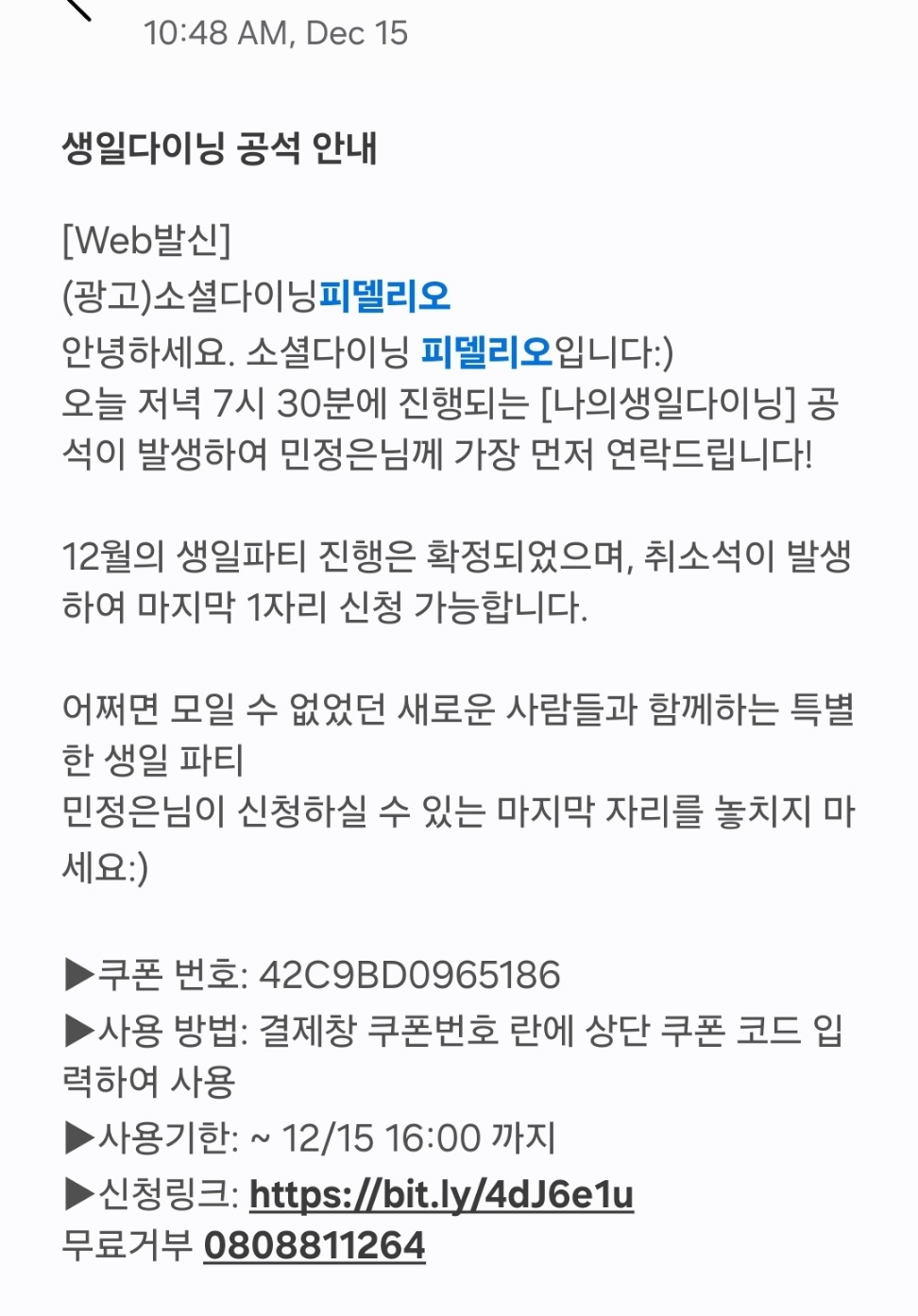 파인다이닝의 경험이 없던 나는 흑백요리사를 보며 그 문화에 관심이 생겼고 + 블라인드 컨셉의 소셜을 경험할 수 있는 피델리오에 관심이 생겨 홈페이지에 전화번호를 남긴 적이 있는데 그 이후로 틈틈히 아래와 같은 문자가 날라왔었다.