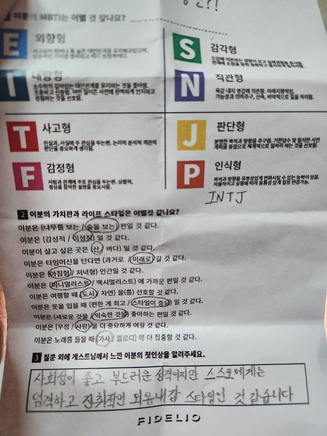 닉네임을 소개하면 직원분이 종이를 나눠준다. 종이엔 아래처럼 상대의 MBTI를 예측하고 첫인상을 쓸 수 있는 빈칸이 있다. 상대는 직원분이 종이를 나눠주는 방식이라 랜덤 형식이고 다양하게 대화를 나누기 위해 일부러 본인 자리에서 멀리 떨어진 사람의 종이를 누눠주신다고 했다. 내가 받은 상대가 누구인지는 나만 알고 있다가 종이를 모두에게 공개할 때 발표되는 형식이다.