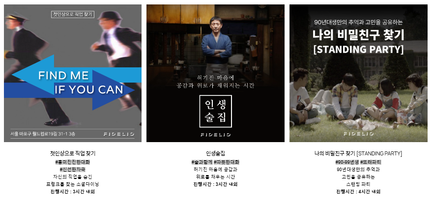 이렇게 6개의 프로그램이 진행되며 크리스마스가 있는 연말에는 또 그때 그때 특별한 이벤트성 프로그램이 열리는 거 같다. 내가 참여했던 프로그램은 '블라인드 다이닝'이다. 태그에 나와있듯 사회적인 프레임(나이,직업,MBTI)를 벗어난 대화를 나눌 수 있는 컨셉이다. 평소 자신을 둘러싼 프레임에서 벗어난 대화를 나눠보고 싶은 분들이 참여하면 좋을 듯하다.